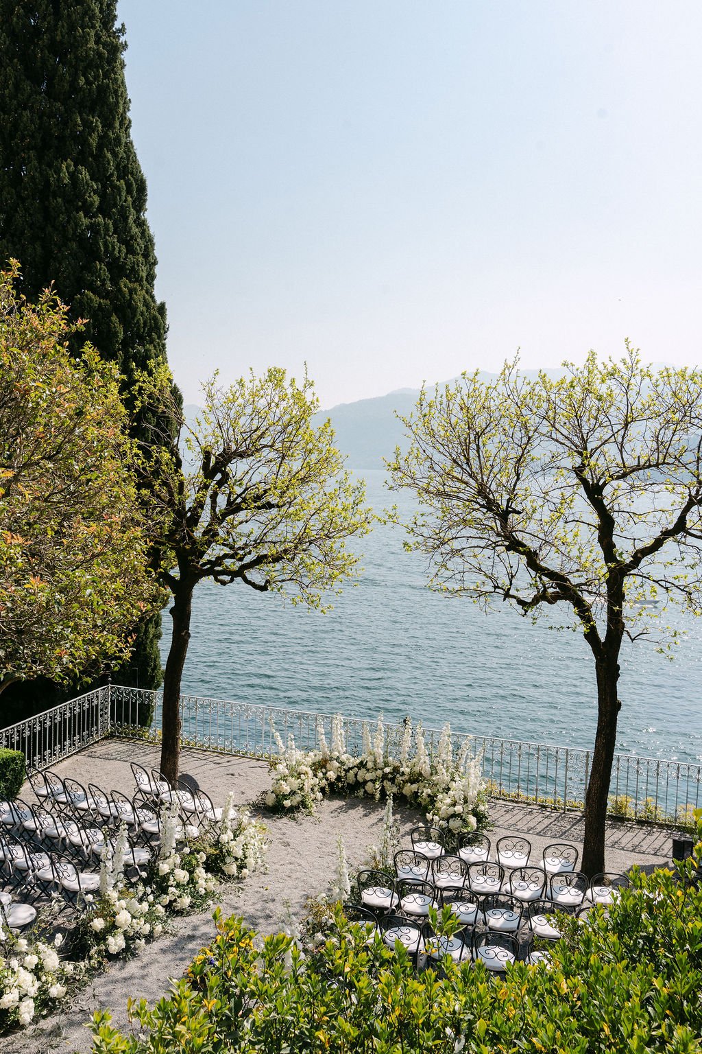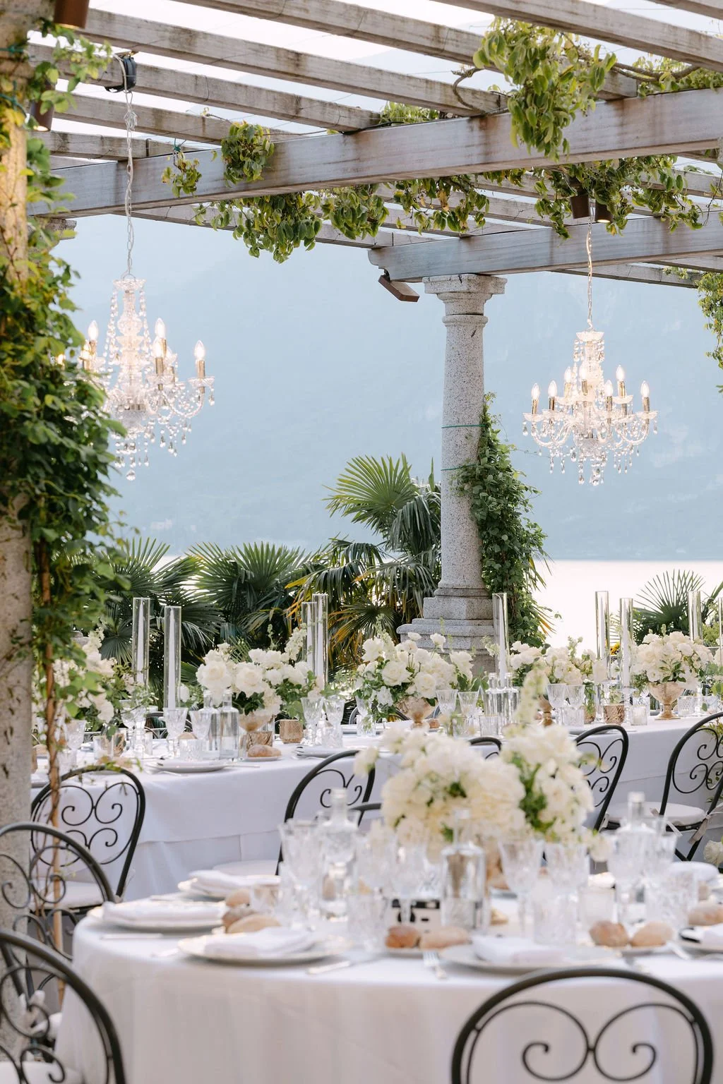 The setting was enhanced with elegant white floral arrangements, designed to highlight—not compete with—the natural beauty of Villa Cipressi and Lake Como. The result was timeless, refined, and effortlessly luxurious.