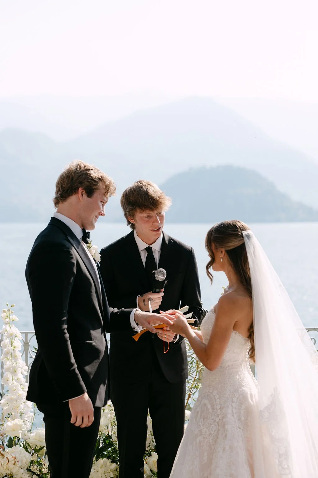After the ceremony, the couple took a boat ride across Lake Como for their portraits. Away from the guests, surrounded by water and mountains, they exchanged their personal vows in private.